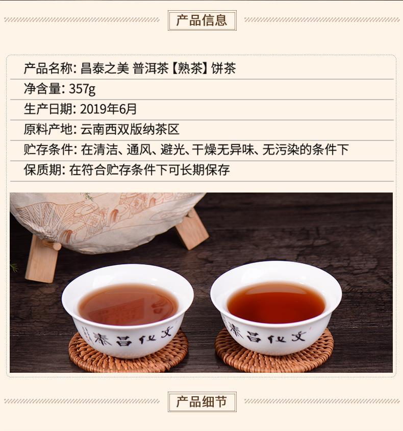 昌泰普洱 2019年 昌泰之美 普洱熟茶 357g 饼茶